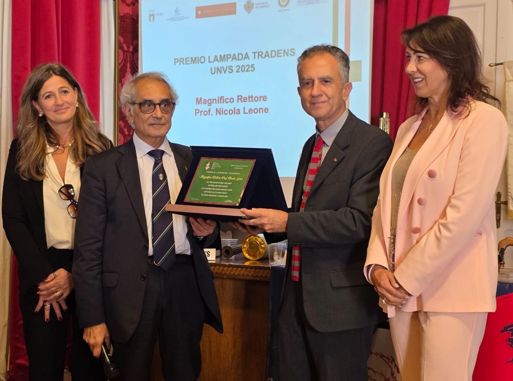 Il premio “Lampada Tradens UNVS 2025” è stato consegnato al Prof. Nicola Leone (Magnifico Rettore UNICAL) “per l’alto impegno profuso nella guida dell’Università della Calabria, per il contributo alla crescita culturale e sociale del territorio e per il costante legame tra mondo accademico e comunità civile”.