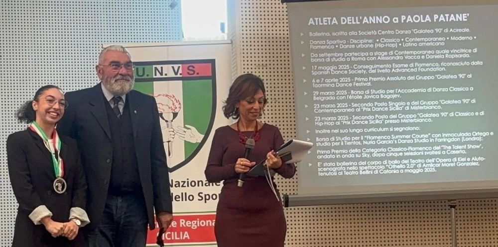 Molto atteso il momento della consegna dei premi per quanto riguarda l’UNVS: i distintivi d’argento sono stati consegnati a Salvatore Marano, ex assistente arbitrale internazionale (l’unico esponente arbitrale internazionale che Acireale abbia fin ora avuto) ed a Giovanni Greco. Risuglia ha poi consegnato il distintivo d’onore a Rosario D’Anna, dirigente nazionale di lungo corso e Stella d’Oro al Merito Sportivo. Come “Atleta dell’anno 2025” è stata nominata la dinamica Paola Patané, atleta della società “Galatea ‘90”, danzatrice esperta in diverse discipline e vincitrice di numerosi premi, che ha ricevuto la speciale Medaglia dal Consigliere nazionale Muscio.