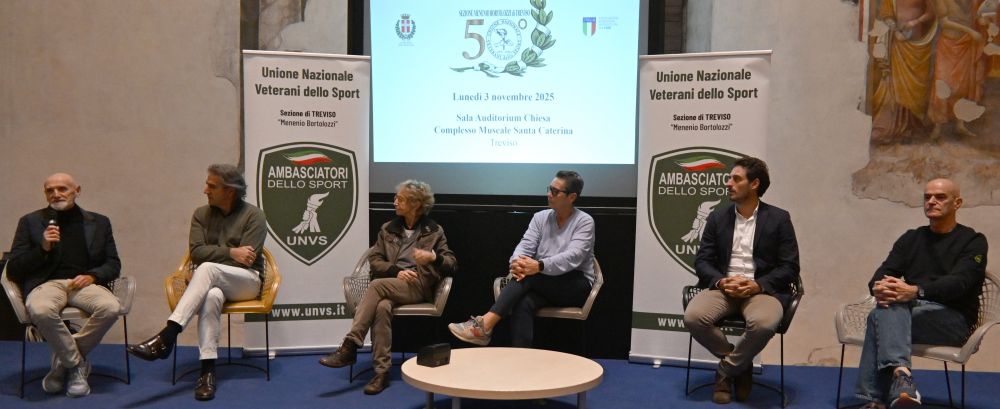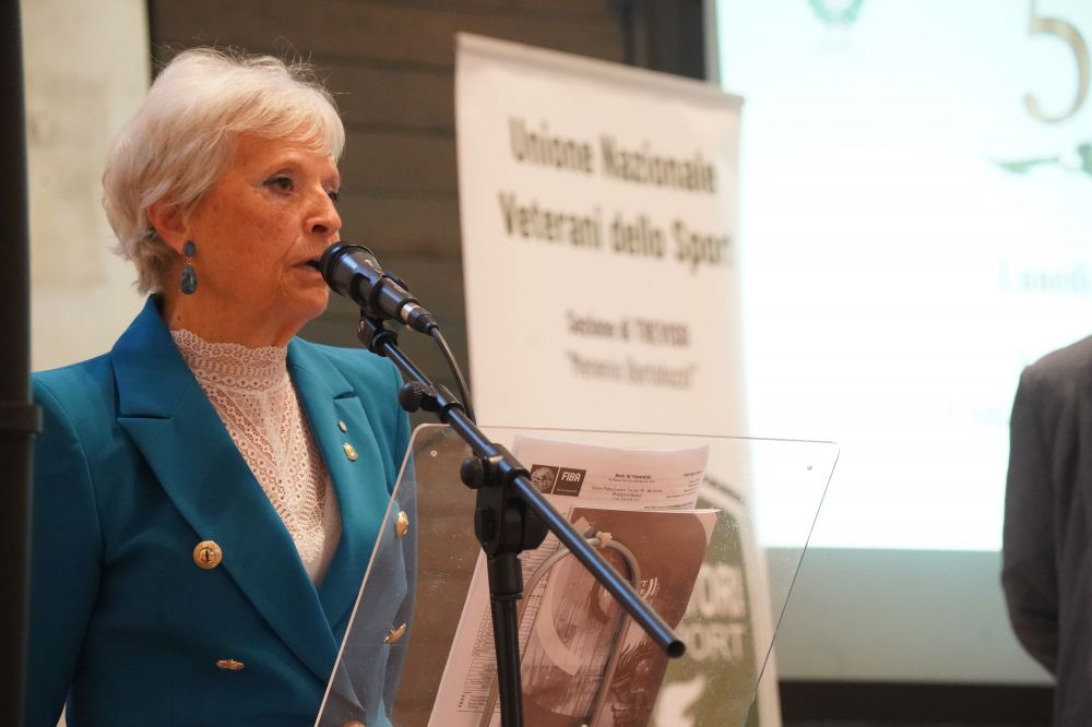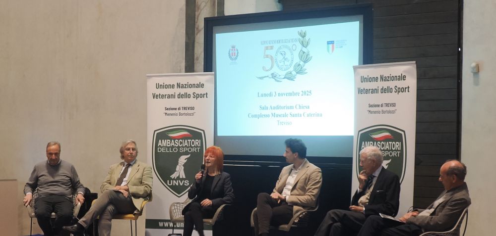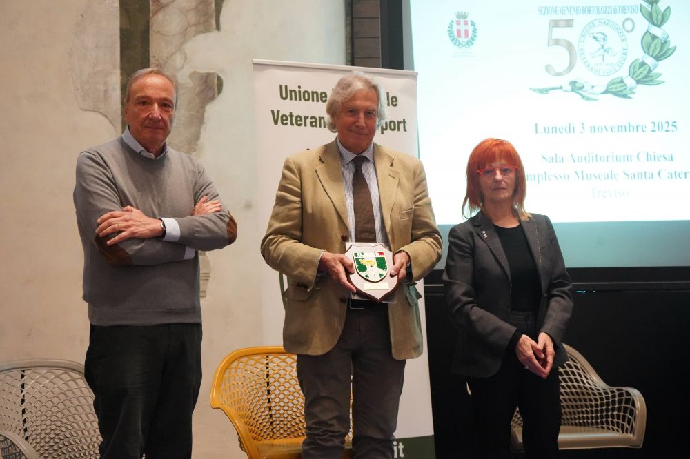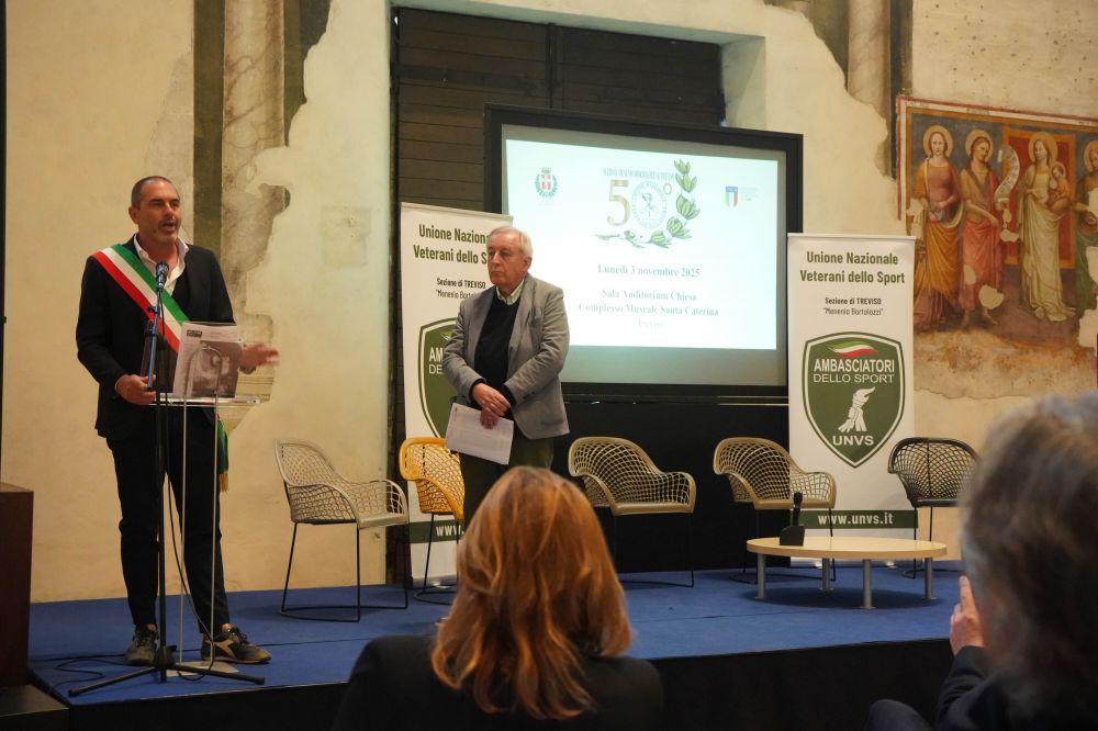 La prestigiosa Sala Auditorium Santa Caterina ha accolto i festeggiamenti per il 50° anniversario dalla fondazione della Sezione UNVS “Menenio Bortolozzi” di Treviso. Alla cerimonia, immancabili il Presidente Patrizia Capuzzo ed il Consiglio Direttivo, il Vicesindaco e Assessore allo Sport Alessandro Manera, il Consigliere Nazionale UNVS Paola Zelanda (in rappresentanza del Presidente Bardelli), oltre che CONI di Treviso, ANSMeS Treviso, CSAin Veneto, Federscherma Veneto, Panathlon Club Treviso, UNVS Vicenza, UOEI Treviso, Tiro a Segno Treviso. La festa (presentata da Silvano Focarelli) si è aperta con il saluto del Presidente Patrizia Capuzzo “Celebriamo mezzo secolo dell’UNVS di Treviso fatto di passione, sacrifici e successi. E’ il tributo a tutti coloro che hanno reso possibile questo sogno. Nata dalla visione di un gruppo di pionieri nel lontano 1975, che decisero di unire le forze per creare la Sezione di Treviso, già intestata al primo Presidente e fondatore, prof. Menenio Bortolozzi. Da allora, abbiamo costruito una vera e propria famiglia, fondata su valori come il rispetto, il merito, la dedizione e la correttezza”