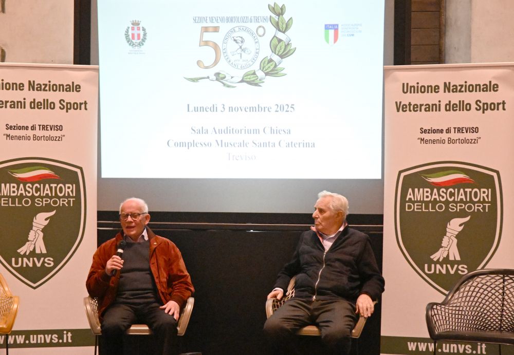 Il format del pomeriggio ha previsto le testimonianze di Armando Faggian, atleta di lotta greco-romana dal 1956 e Tino Busato ex rugbista e Presidente del Rugby Casale, ex Consigliere di UNVS Treviso. Entrambi firmatari del documento di fondazione della Sezione nel 1975.