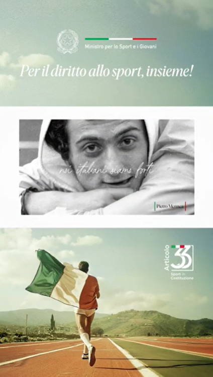 Il filmato, evocativo e suggestivo, avrà un'ampia diffusione, dalle TV ai device di ultima generazione, dalle reti RAI ai social. L'obiettivo è comunicare e diffondere il significato del comma 7 dell'articolo 33 della Costituzione: “La Repubblica riconosce il valore educativo, sociale e di promozione del benessere psicofisico dell'attività sportiva in tutte le sue forme”. La campagna (creata da Shado), è realizzata con la tecnica video della frammentazione e racconta come lo sport, i suoi valori, le sue dinamiche e le sue storie, siano indissolubilmente connessi e intrecciate con la nostra vita. Grazie alle potenzialità offerte dalla tecnologia, è stato reso possibile un racconto nel quale Pietro Mennea (il grande campione scomparso nel 2013) attraverso la “voice cloning”, è diventato il narratore e custode di questi valori, scandendo e accompagnando momenti e istantanee scolpite nella nostra memoria.