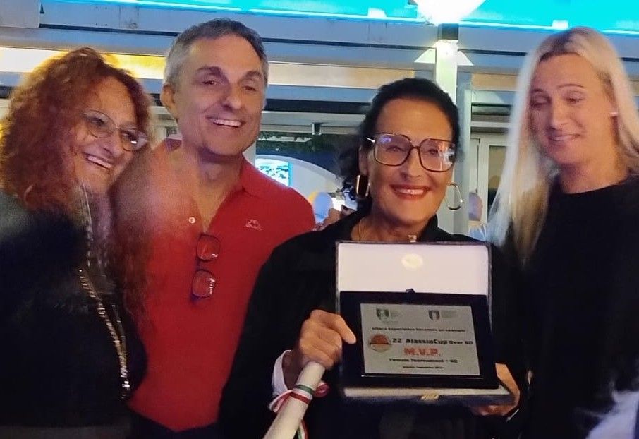Nelle foto l’organizzatore Binetti, Bosio e Simone Santi giocatore, e Floriana Becchi, Binetti; Bosio e Anita Hyrske premiata quale giocatrice femminile over 50 della Finlandia