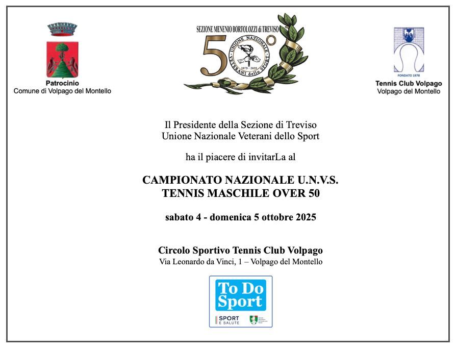 La Sezione di Treviso annuncia il ritorno del Campionato Nazionale UNVS Tennis Maschile over 50 per l’edizione 2025, che si terrà il prossimo 4 e 5 ottobre a Volpago del Montello (Tv) presso il Circolo Sportivo Tennis Club Volpago.