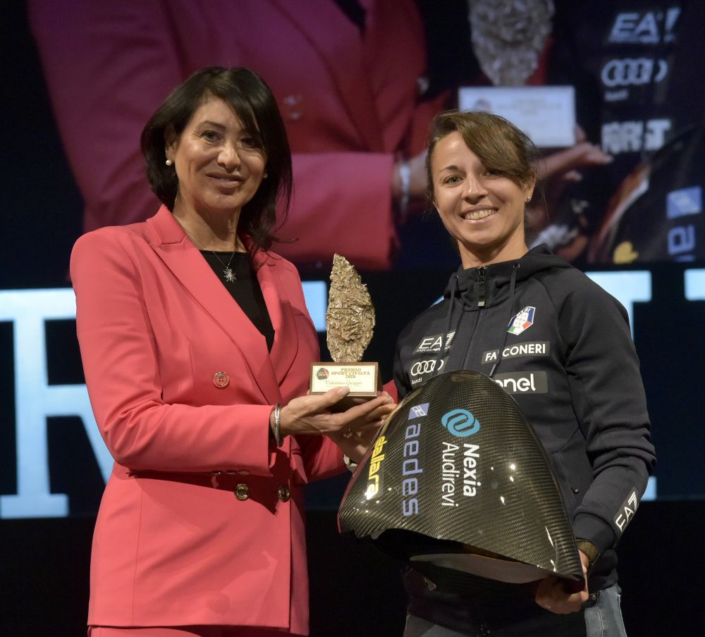 A rendere grande lo spettacolo non solo gli ospiti illustri (anche quelli venuti da tutta Italia, compresa la Presidente Nazionale dell’UNVS prof. Francesca Bardelli, accompagnata per la circostanza dal Comitato di Presidenza). E’ stata lei a premiare Valentina Greggio che ha affrontato il pubblico con il casco della Dallara, per ricordare a tutti che è campionessa di sci velocità. E’ stata premiata come ‘Ambasciatore dello Sport’ (dizione che UNVS da tempo ha fatto sua). Titolo meritatissimo per il record di 247,083 km/h, i cinque titoli mondiali e le sette Coppe del Mondo messe in bacheca. Ha intrattenuto il pubblico puntando su qualche rivelazione. Come quando, in vista di migliorare le proprie performances, ha raccontato che decise di scrivere una mail a Dallara, che gli rispose augurandole che quello fosse il giorno più bello in cui iniziava un nuovo capitolo. Ha confessato anche il suo sogno premonitore, la notte prima di stabilire il record del mondo, quando sognò di battere gli uomini in una gara di Coppa del Mondo.