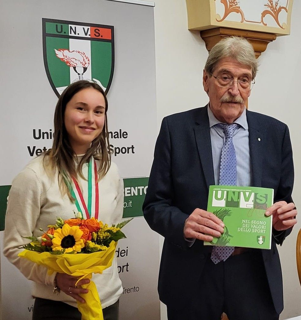 Al termine, il momento più atteso: la presentazione e premiazione dell’”Atleta dell’anno 2025”, scelta dal Consiglio sezionale: la giovane Giulia Riccardi, di Cadine, accompagnata dal suo allenatore, il padre Cristian. Giulia è nata nel 2023 ed ha già un palmares notevole: fra l’altro è vicecampionessa italiana assoluta di salto in lungo ed anche U23, vicecampionessa italiana di eptathlon e terzo posto ai campionati italiani assoluti di pentathlon. In ragione di questi exploits è entrata nel team azzurro. Il suo curriculum sportivo fa intravvedere un futuro molto promettente. L’atleta ha parlato della sua carriera e dei suoi programmi futuri ed è stata applaudita con convinzione da tutti i presenti. Ha poi espresso il suo ringraziamento per il premio assegnatole, per il magnifico medaglione e per l’accoglienza ricevuta.
